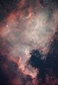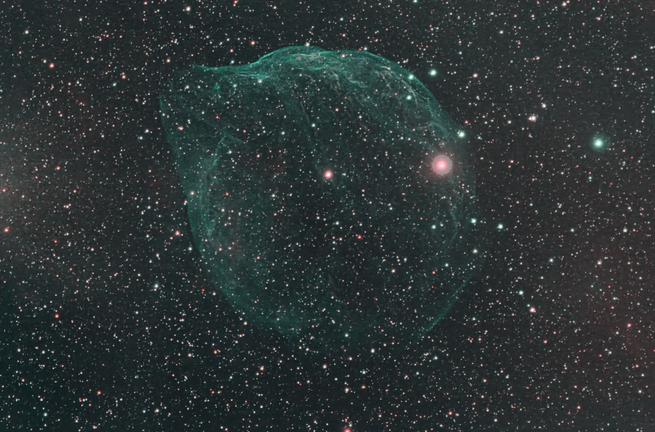 アップのアイリス星雲、星雲を取り囲む分子運が淡い領域までしっかり炙られてますねー。不謹慎な言い方ですが、アイリス星雲から闇の衣が噴き出しているようなおどろおどろしい雰囲気をまとっているようです。